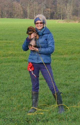 anderen Teckelchen bei einer Spurlaut-Übung teil. Mutig und Tapfer zeigte sie vollen Einsatz im Raps und ließ sich auch vom Regen nicht abhalten den anderen Teckelchen nach zu eifern.